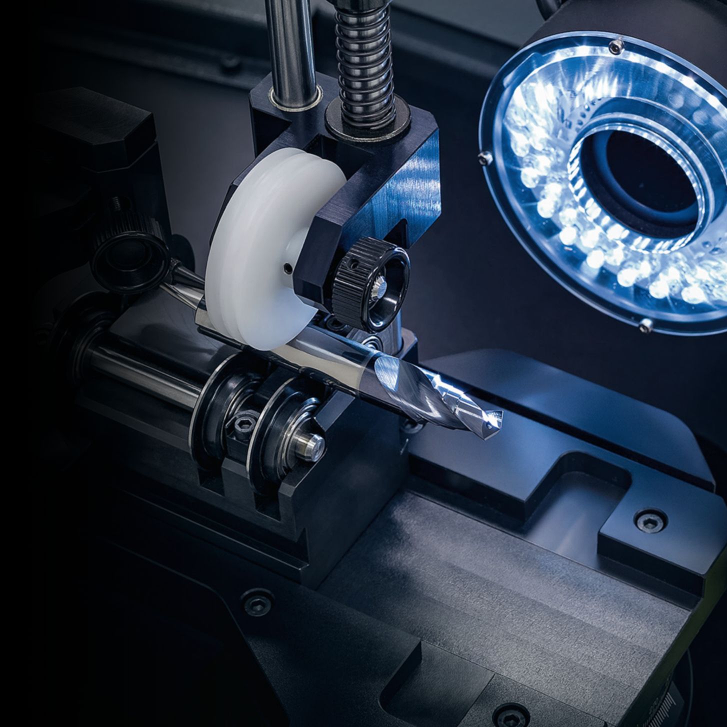 Mit der Werkzeugaufnahme »pomPrisma« spannen Sie Werkzeuge mit einem Schaftdurchmesser von 2 – 50 mm. Der dazu passende Schwenktisch ist mit einem Rotationsgeber ausgestattet. Dadurch richten Sie das Werkzeug, unterstützt durch die Software, schnell und sicher im Soll-Winkel aus.