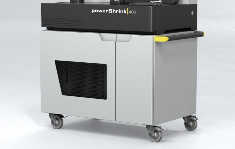 Au lieu d’une installation sur un établi, le »powerShrink 400« peut être positionné sur une table d’appoint d’une hauteur de travail optimale en termes d’ergonomie. Le refroidisseur et l’aspiration du gaz de fumée sont situés dans un endroit rangé à l’intérieur de celui-ci. La table d’appoint est disponible en option avec des roulettes stables et une poignée ergonomique pour permettre un positionnement variable du »powerShrink 400«.
