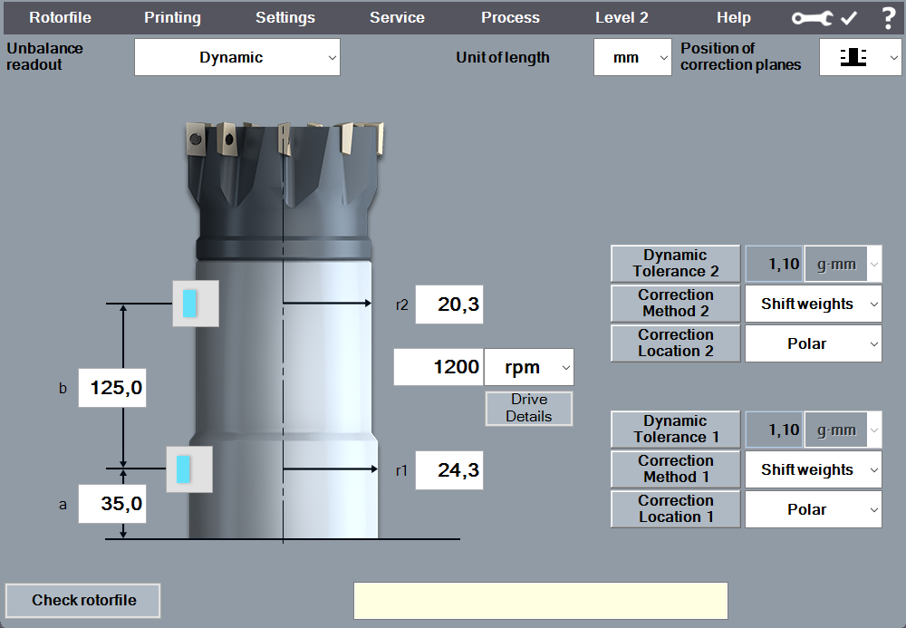 Balanssızlık eksenel delme yoluyla dengelenir. Deliklerin sayısı, açısal konumu ve derinliği otomatik olarak hesaplanır.